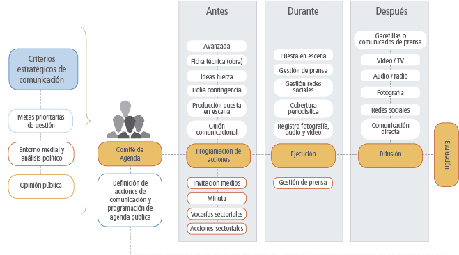 El esquema describe el flujo de trabajo de la acción comunicacional asociada, a la agenda de una autoridad pública (ver Centro de Gestión). En un primer momento de programación estratégica se definen los criterios básicos para la gestión comunicacional defiendo cuales son los temas prioritarios, el entorno medial y los segmentos de la opinión pública a la que se quiere llegar. Un Comité de Agenda se encarga de proponer las acciones a incorporar en la agenda pública de la autoridad. A continuación, el flujo de trabajo se divide en un antes, durante y después de la acción comunicacional, siguiendo la lógica de un proceso de pre producción, producción y post producción de piezas comunicacionales.